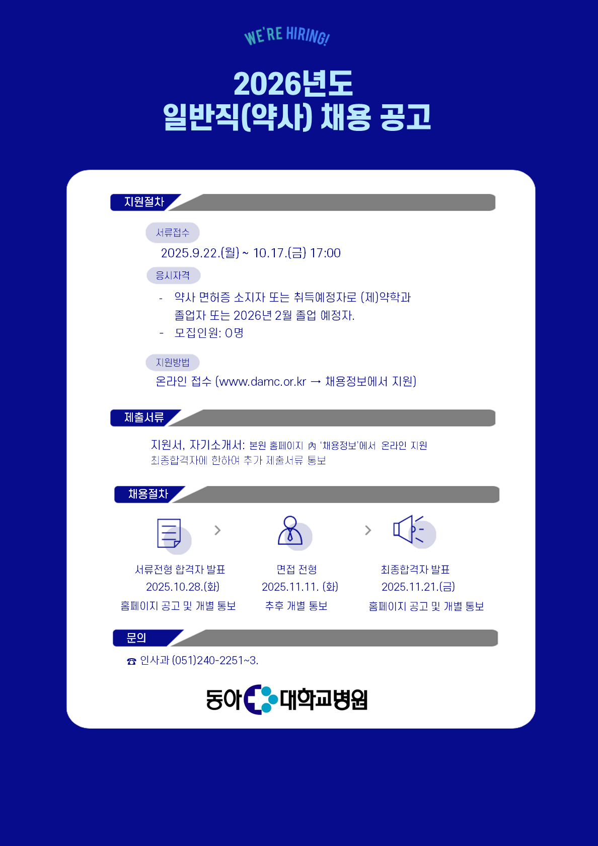 약제부 | 약사 | - 약사 면허증 소지자 또는 취득예정자로 (제)약학과 졸업자 또는 2026년 2월 졸업 예정자. | ○명 |