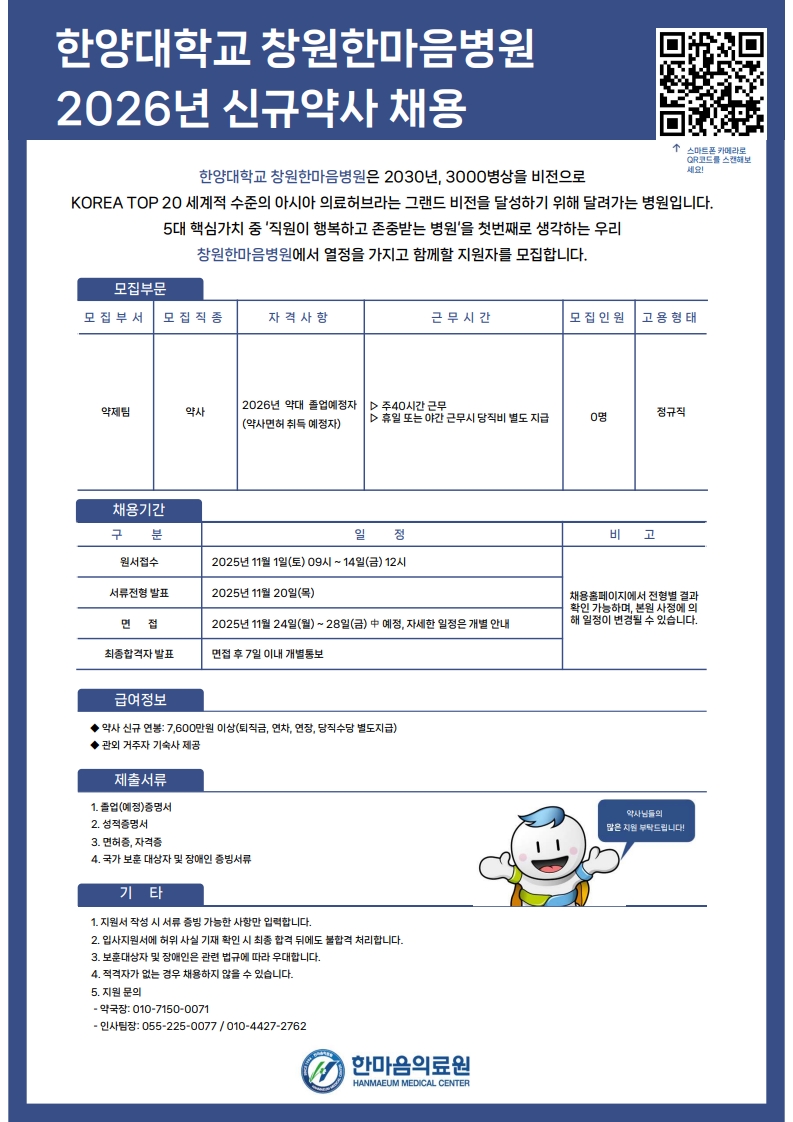 ※ 채용공고는 담당자 이메일로 보내주시기 바랍니다. (담당자 : ysyoung@pusan.ac.kr) fnctId=bbs,fnctNo=2435 작성일 2025.10.29 수정일 2025.10.29 작성자 취업정보 조회수 15 한양대학교 창원한마음병원 첨부파일 창원한마음병원 2026년 채용공고.jpg 미리보기